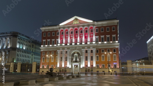 Naklejka premium Historical building of Moscow City Hall at Tverskay street at evening lightning with light trains timelapse , Moscow, Russia