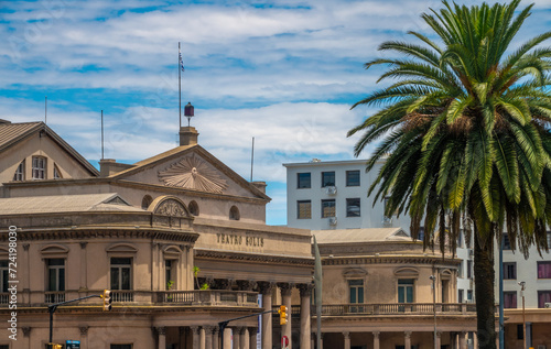 Naklejka premium Historical buildings along Independence square, Montevideo, Uruguay, including the iconic Teatro Solis, the oldest Opera House in South America