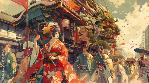 © MaiHuong Studio, Naklejka premium Historical events, July 4th Parade, fantastical illustrations filled with vivid colors, Japanese manga illustrations, High-def