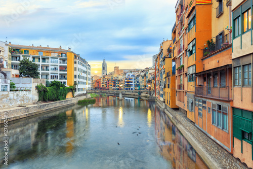 Fototapeta premium historical jewish quarter in Girona, view of the river at sunrise, Barcelona, Spain, Catalonia