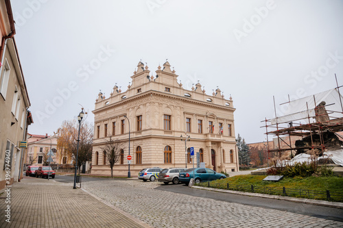 Fototapeta premium Historical neo renaissance building of city hall at main town Husovo Square at cloudy autumn day, Cesky Brod, Central Bohemia, Czech Republic