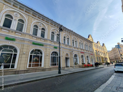 © yavdat, Obraz premium historical pink building with multiple floors, adorned with decorative features and air conditioning units on its windows. The combination of classic design and modern amenities highlights urban