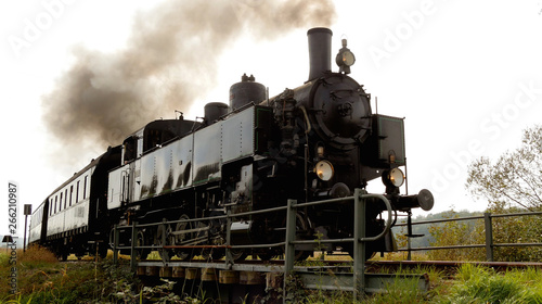 © stockmedia, Naklejka premium Historical Retro Steam Engine Train Driving on Railroad Track