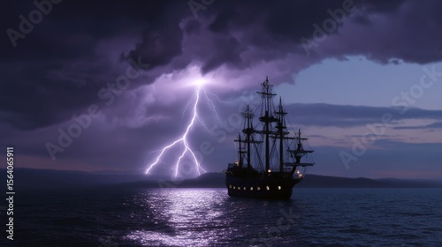Fototapeta premium Historical sailing ship against dramatic lightning and stormy sky