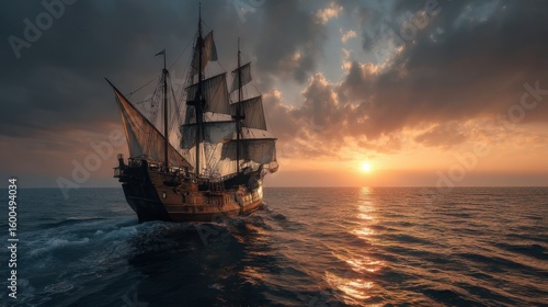 © Zafa, Fototapeta premium Historical Sailing Ship at Sunset
