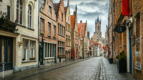 Fototapeta premium Historical streetscape in Bruges featuring cobblestone road and architectural...