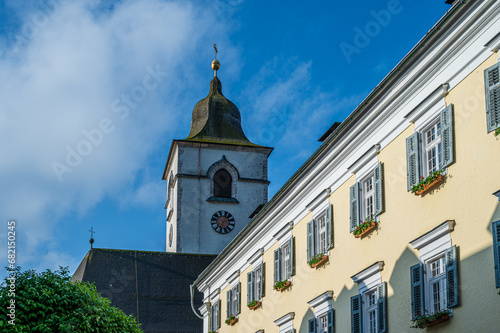 Obraz premium Historische Häuserfront und Kirchturm von St. Wolfgang im Salzkammergut