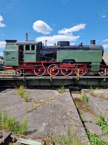 © evamsi, Naklejka premium historische rot grüne Dampflok auf Drehscheibe
