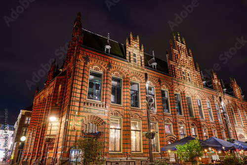 © hespasoft, Fototapeta premium Historisches ehemaliges Postgebäude in Arnheim bei Nacht