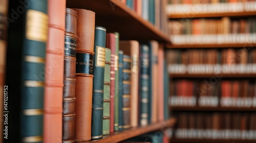 © Omias, Naklejka premium History Legacy Impact Concept, Grand Library Filled with Centuries-Old Books in Classic Wooden Bookshelves