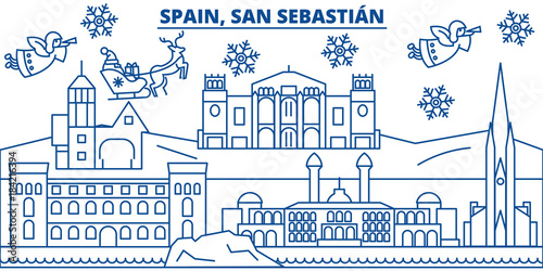 © iconsgraph, Fototapeta premium Hiszpania, panoramę miasta San Sebastian zimą. Wesołych Świąt, szczęśliwego nowego roku ozdobione baner z Santa Claus.Winter życzeniami linii. Płaskie, wektor zarys. Liniowa ilustracja bożego narodzenia śniegu
