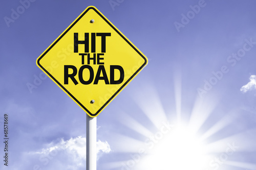 Naklejka premium Hit The Road road sign with sun background