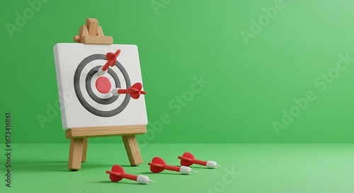 © SD AI, Obraz premium Hitting the bullseye a 3D illustration of darts aimed at a target board set on an easel, symbolizing success, precision, and achieving goals with a clear green background
