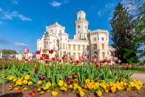 © Mistervlad, Fototapeta premium Hluboka nad Vltavou Castle and spring flowers, Czech Republic