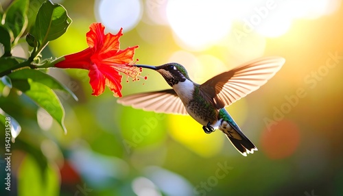 Obraz premium Hmmingbird feeding on a flower nectar, with blurred wings, vibrant plumage,...
