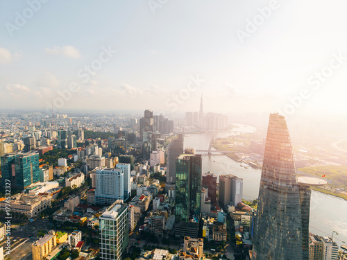 © Parilov, Obraz premium Ho Chi Minh City skyline and skyscrapers on Saigon river Aerial view with sunlight. Financial business center at downtown sunset time.