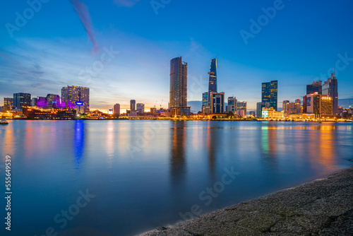 © Quang Ho, Fototapeta premium Ho Chi Minh City skyline and the Saigon River at night. Amazing colorful view of skyscraper and other modern buildings. Travel concept