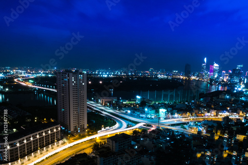 © Dung, Fototapeta premium Ho Chi Minh City/ Vietnam: Downtown Saigon from the above view, aerial view at dusk, royalty high quality free stock image view from above of Ho Chi Minh City/ Saigon