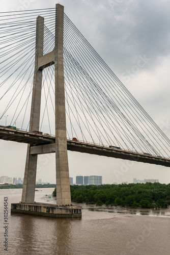 © Klodien, Naklejka premium Ho Chi Minh City, Vietnam - March 12, 2019: Long Tau and song Sai Gon rivers meeting point. Closeup of H-shaped pylon of Phu My suspension bridge under gray cloudscape.