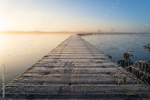 © sanderstock, Naklejka premium Hoarfrost on a jetty (Knuppelpad) in nature reserve Roegwold during a cold, autumn sunrise.