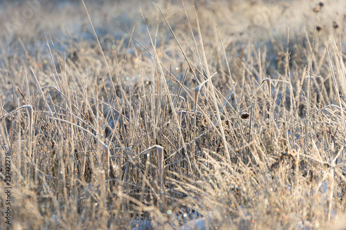 Fototapeta premium Hoarfrost on dried plants macro selective focus, morning sun light.