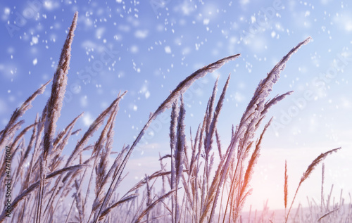 Obraz premium Hoarfrost on the plant at sunrise. Winter season. Beauty in nature.