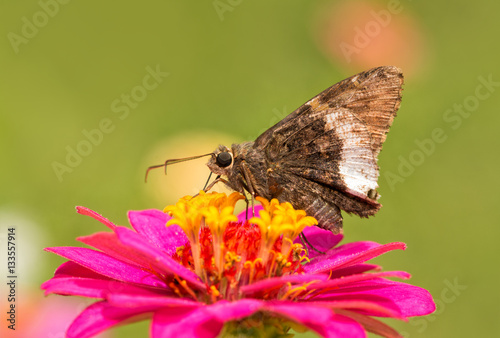Fototapeta premium Hoary Edge butterfly on a bright pink Zinnia in summer garden
