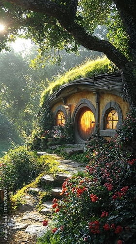 Fototapeta premium Hobbit-style architecture with shadowy rosemary patterns and unique, whimsical visuals