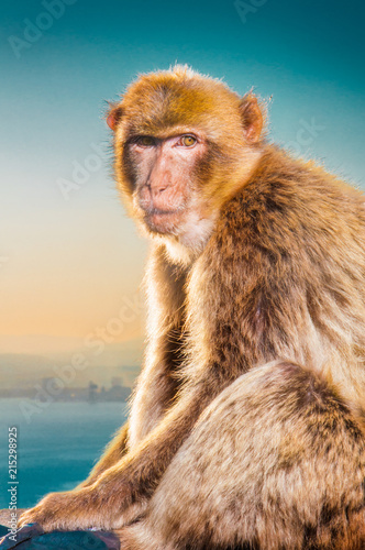 Naklejka premium Hochkant Makakenportrait bei Sonnenuntergang