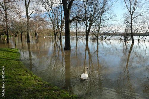 Fototapeta premium Hochwasser am Rhein bei Bendorf mit Überflutung von Parkanlage mit Bäumen im Wasser und Schwan - Stockfoto