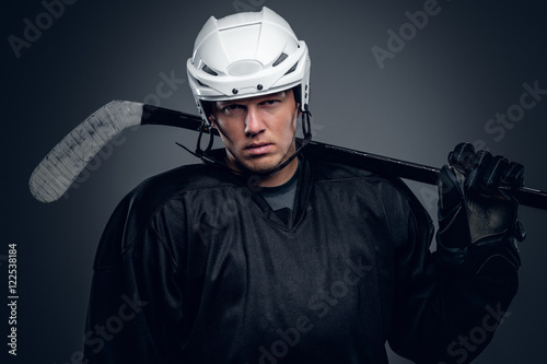Naklejka premium Hockey player holds gaming stick.