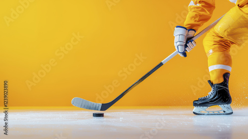 Obraz premium Hockey player in yellow uniform skating on ice with puck