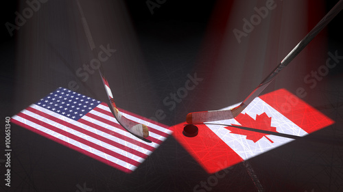 Fototapeta premium Hockey puck, hockey sticks and the image of the Unites States and Canadian flag on the ice.