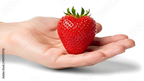 © Marlon, Obraz premium Holding a Fresh, Vibrant Strawberry in Hand for Healthy Eating Concepts and Summer Treats, Perfect for Nutrition and Delicious Dessert Imagery