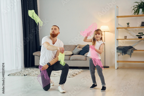 © standret, Fototapeta premium Holding cloth. Father with his little daughter is at home together