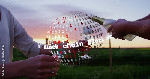 Fototapeta premium Holding couple getting poured wine into wine glasses in grassy sunset field with Block chain globe