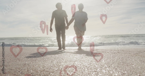 Obraz premium Holding hands senior couple walking along sunlit shoreline, with red heart and location-pin icons