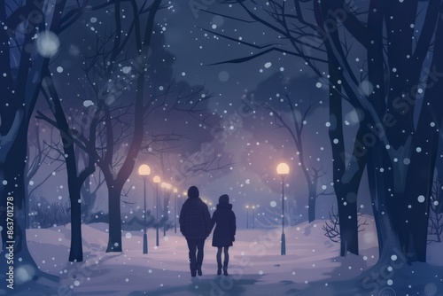 Obraz premium Holding hands with a loved one while strolling through a snowy park, cozy...