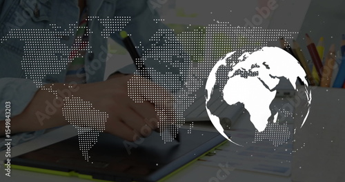 Naklejka premium Holding stylus, artist drawing on tablet at desk, showing colored pencils and world map overlay