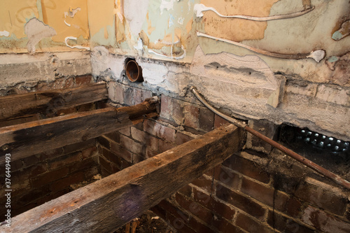 Obraz premium Hole in floorboards during home renovation showing into house foundations with rotting damaged joists and bare plaster walls