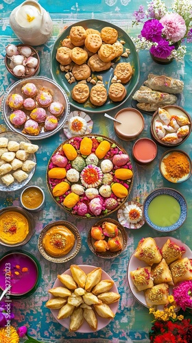 © CREATIVE STOCK, Fototapeta premium Holi Food Table with Sweet Treats and Traditional Drinks, Holi