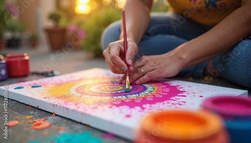 Fototapeta premium Holi. Woman painting colorful mandala on canvas outdoors