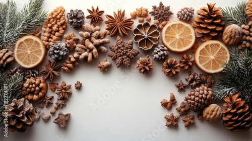 © Stocker, Fototapeta premium Holiday Baking Decoration with Pinecones and Oranges. Generative AI