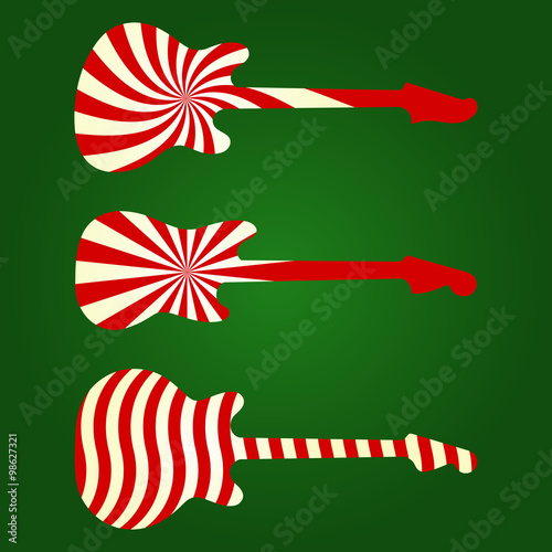 © funkyplayer, Fototapeta premium Holiday concept guitar silhouettes. Peppermint candy color guitar collection on green background. Vector illustration