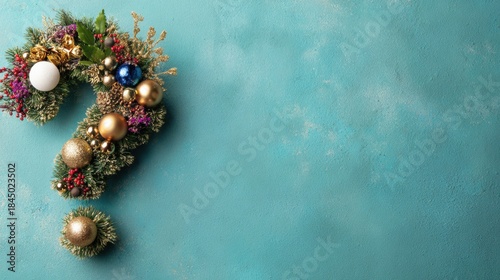 Fototapeta premium Holiday decorations arranged in a question mark shape on a blue surface