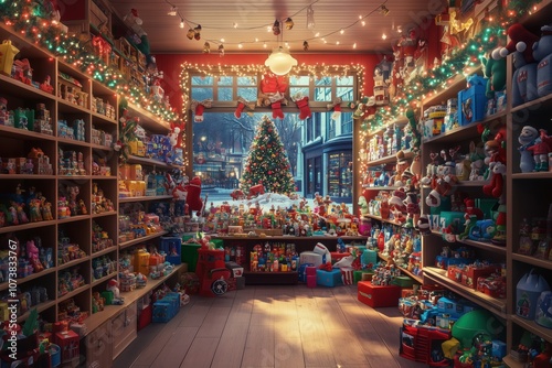 © Thomas, Naklejka premium Holiday display featuring toys and bright Christmas lighting