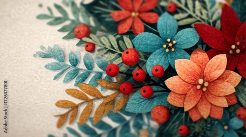 Fototapeta premium Holiday flyer with illustrated Christmas elements, festive catalog background