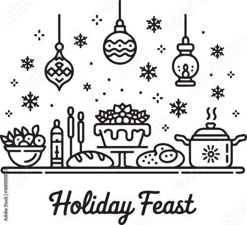 © Shamim, Naklejka premium Holiday Food Vector Icons Collection Festive Dinner Table, Cake, Bread, Tea Kettle, Ornament, Lantern, Fruit Bowl, and Cooking Pan