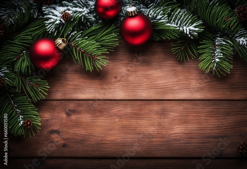 Fototapeta premium Holiday Greeting Card - Pine Twig and Ornaments on Snow-Dusted Wood