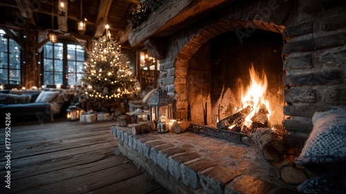 © Crocodilchik, Obraz premium Holiday interior scene fireplace burning warmly decorated tree cozy Christmas home atmosphere